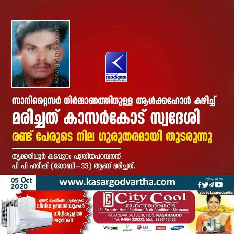 സാനിറ്റൈസര് നിര്മ്മാണത്തിനുള്ള ആള്ക്കഹോള് കഴിച്ച് മരിച്ചത് കാസര്കോട് സ്വദേശി; രണ്ട് പേരുടെ നില ഗുരുതരമായി തുടരുന്നു