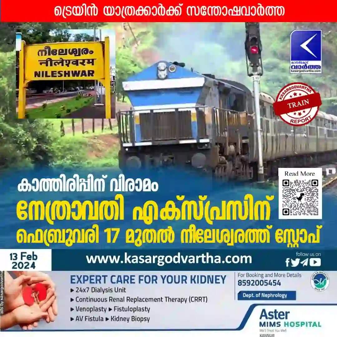 Train Stop | കാത്തിരിപ്പിന് വിരാമം! നേത്രാവതി എക്സ്പ്രസിന് ഫെബ്രുവരി 17 മുതൽ നീലേശ്വരത്ത് സ്റ്റോപ്