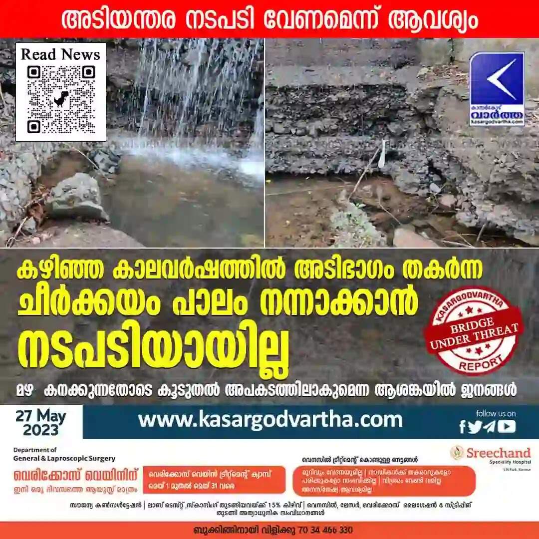 Bridge Damaged | കഴിഞ്ഞ കാലവർഷത്തിൽ അടിഭാഗം തകർന്ന ചീർക്കയം പാലം നന്നാക്കാൻ നടപടിയായില്ല; മഴ കനക്കുന്നതോടെ കൂടുതൽ അപകടത്തിലാകുമെന്ന ആശങ്കയിൽ ജനങ്ങൾ