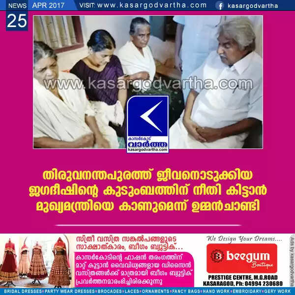 തിരുവനന്തപുരത്ത് ജീവനൊടുക്കിയ ജഗദീഷിന്റെ കുടുംബത്തിന് നീതി കിട്ടാന് മുഖ്യമന്ത്രിയെ കാണുമെന്ന് ഉമ്മന്ചാണ്ടി