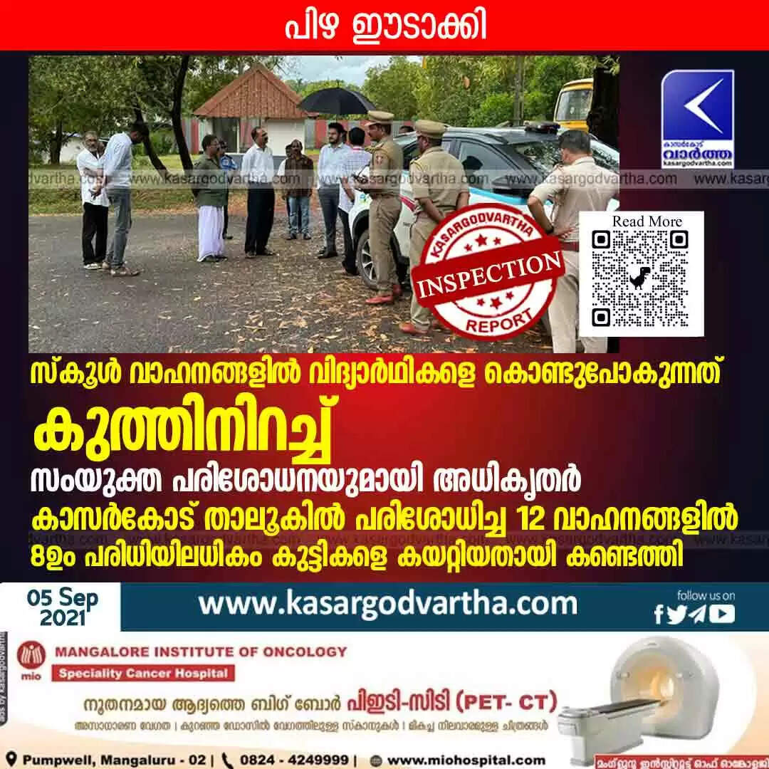 കാസർകോട് താലൂകിൽ 12 വാഹനങ്ങൾ പരിശോധിച്ചു. എട്ടെണ്ണം പരിധിയിലധികം കുട്ടികളെ കയറ്റിയതായി കണ്ടെത്തി. 9500 രൂപ പിഴ ഈടാക്കി. മോടോർ വെഹികിൾ ഇൻസ്പെക്ടർ ചന്ദ്ര കുമാർ, എഎംവിഐ എം പ്രവീൺ കുമാർ എന്നിവർ പങ്കെടുത്തു.