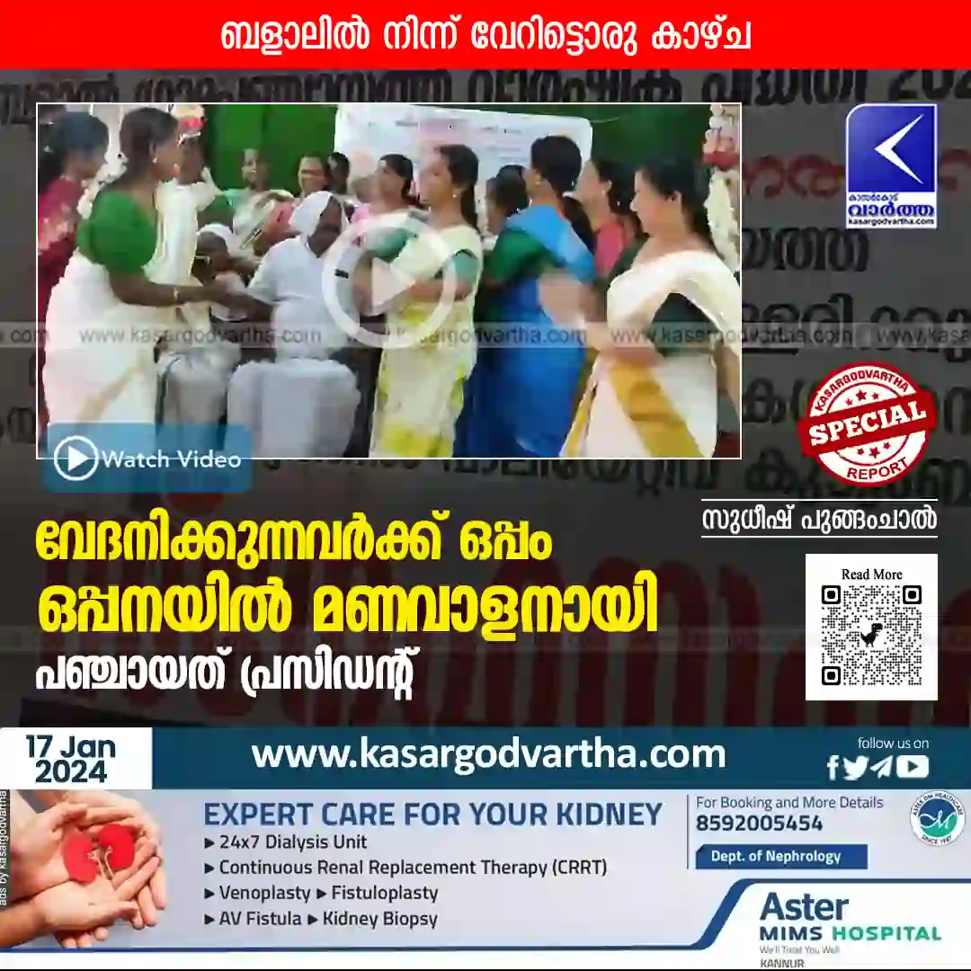 രോഗത്താലും വേദനയിലും ദുരിതമനുഭവിക്കുന്ന കുടുംബ ങ്ങൾക്കൊപ്പംപാട്ടുപാടിയുള്ള ആഘോഷത്തിൽ അകന്ന് നിൽക്കാതെ അവർക്ക് ഒപ്പം ചേർന്ന് നിന്ന പ്രസിഡണ്ടിന് സദസ് നിറഞ്ഞ കയ്യടിയാണ് നൽകിയത്. അവതാരകനും നാടൻ പാട്ടു കലാകാരനും കൂടിയായ സുരേഷ് അറുകരയാണ് 80 വയസ് കഴിഞ്ഞ രണ്ട് അമ്മമാർക്ക് ഒപ്പം നടക്കുന്ന ഒപ്പനയിൽ ഒരു മണവാളൻ കൂടി വേണമെന്ന് മൈകിലൂടെ അഭ്യർഥിച്ചത്.