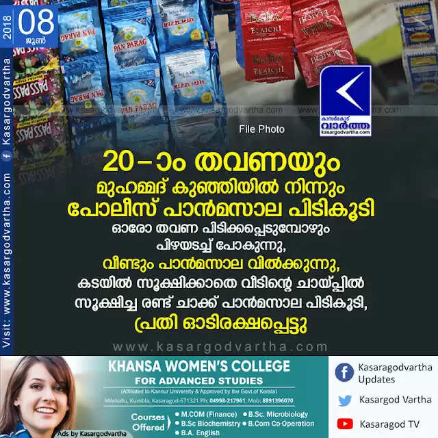 20-ാം തവണയും മുഹമ്മദ് കുഞ്ഞിയില്‍ നിന്നും പോലീസ് പാന്‍മസാല പിടികൂടി; ഓരോ തവണ പിടിക്കപ്പെടുമ്പോഴും പിഴയടച്ച് പോകുന്നു, വീണ്ടും പാന്‍മസാല വില്‍ക്കുന്നു, കടയില്‍ സൂക്ഷിക്കാതെ വീടിന്റെ ചായ്പ്പില്‍ സൂക്ഷിച്ച രണ്ട് ചാക്ക് പാന്‍മസാല പിടികൂടി, പ്രതി ഓടിരക്ഷപ്പെട്ടു
