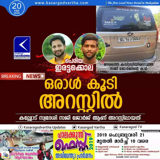 പെരിയ: (www.kasargodvartha.com 20.02.2019) കല്യോട്ട് രണ്ട് യൂത്ത് കോണ്‍ഗ്രസ് പ്രവര്‍ത്തകരെ വെട്ടിക്കൊലപ്പെടുത്തിയ കേസില്‍ കൊലയാളി സംഘത്തിലെ ഒരാള്‍ കൂടി അറസ്റ്റില്‍. കല്ല്യോട് സ്വദേശി സജി ജോര്‍ജ് ആണ് അറസ്റ്റിലായത്. ബുധനാഴ്ച രാത്രി 10 മണിയോടെയാണ് ഇയാളുടെ അറസ്റ്റ് രേഖപ്പെടുത്തിയത്. നേരത്തെ പോലീസിന്റെ കസ്റ്റഡിയിലുള്ളയാളായിരുന്നു സജി ജോര്‍ജ്. ഇയാളുടെ കാര്‍ നേരത്തെ പോലീസ് കസ്റ്റഡിയിലെടുത്തിരുന്നു.