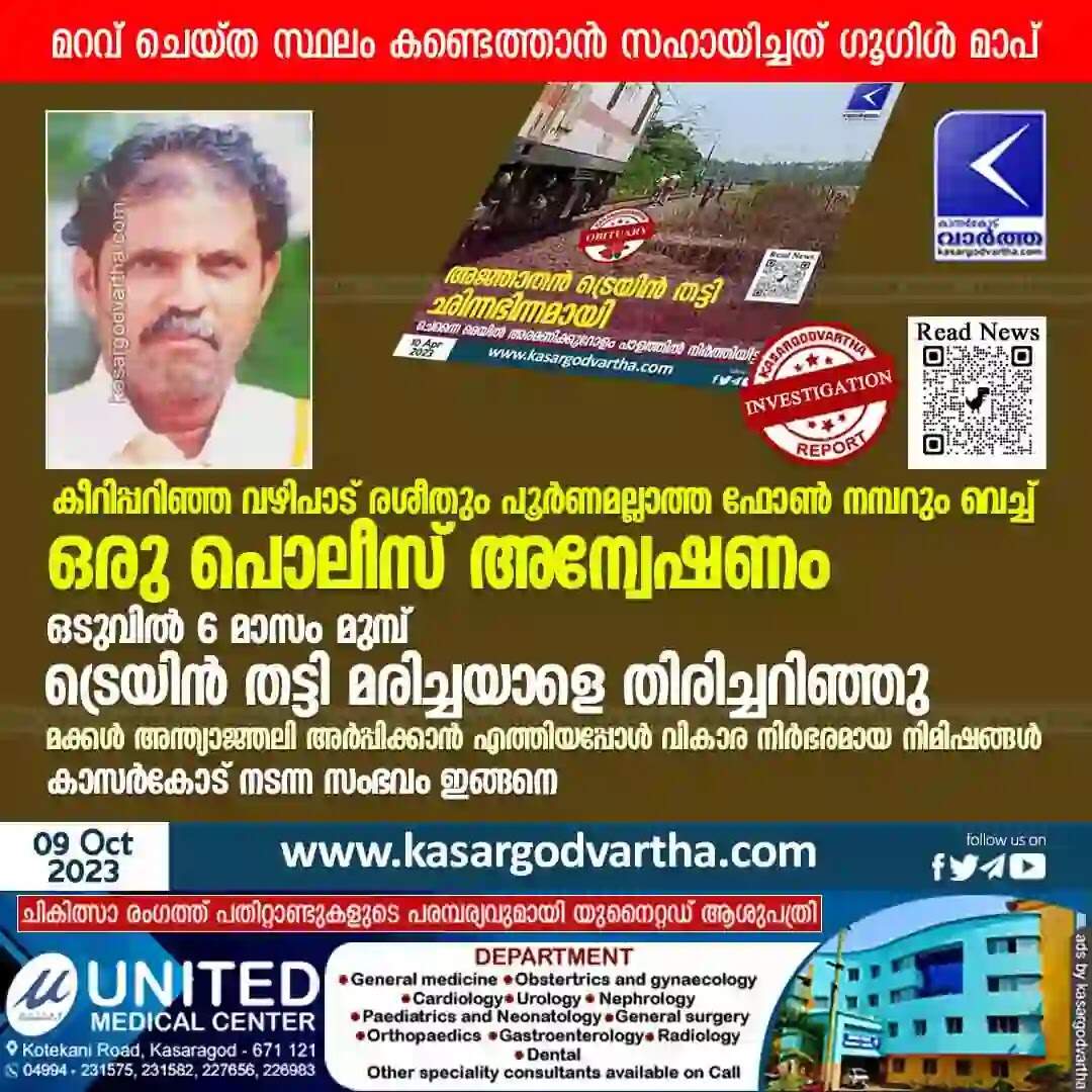 Investigation | കീറിപ്പറിഞ്ഞ വഴിപാട് രശീതും പൂർണമല്ലാത്ത ഫോൺ നമ്പറും വെച്ച് ഒരു പൊലീസ് അന്വേഷണം; ഒടുവിൽ 6 മാസം മുമ്പ് ട്രെയിൻ തട്ടി മരിച്ചയാളെ തിരിച്ചറിഞ്ഞു; മക്കൾ അന്ത്യാജ്ഞലി അർപ്പിക്കാൻ എത്തിയപ്പോൾ വികാര നിർഭരമായ നിമിഷങ്ങൾ; കാസർകോട് നടന്ന സംഭവം ഇങ്ങനെ