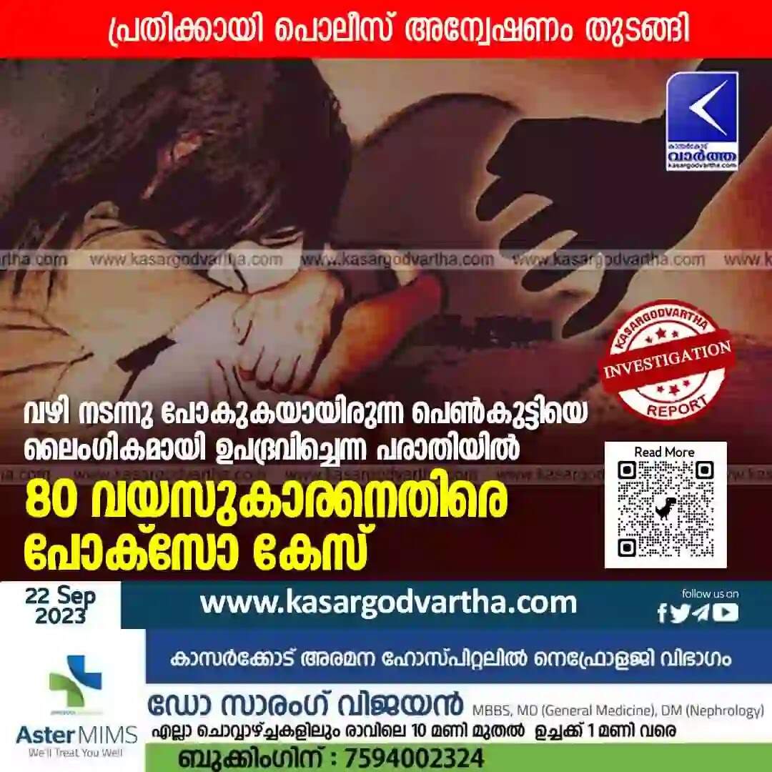 POCSO case | വഴി നടന്നു പോകുകയായിരുന്ന പെണ്കുട്ടിയെ ലൈംഗികമായി ഉപദ്രവിച്ചെന്ന പരാതിയില് 80 വയസുകാരനെതിരെ പോക്സോ കേസ്