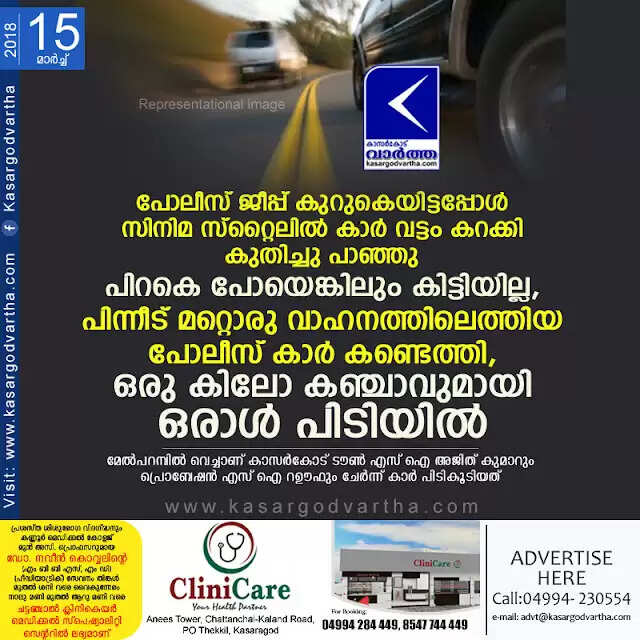 കാസര്‍കോട്: (www.kasargodvartha.com 15.03.2018) കഞ്ചാവ് സംഘം എത്തിയതായുള്ള രഹസ്യവിവരത്തിന്റെ അടിസ്ഥാനത്തില്‍ സ്ഥലത്തെത്തിയ പോലീസ്, ജീപ്പ് കുറുകെയിട്ട് പിടിക്കാന്‍ ശ്രമിച്ചെങ്കിലും കഞ്ചാവ് സംഘം സിനിമ സ്‌റ്റൈലില്‍ കാര്‍ വട്ടം കറക്കി കുതിച്ചു പാഞ്ഞു. പോലീസ് പിന്തുടര്‍ന്നെങ്കിലും അതിവേഗതയില്‍പോയ കാര്‍ കണ്ടെത്താനായില്ല. പിന്നീട് മറ്റൊരു വാഹനത്തിലെത്തിയ പോലീസ് കാര്‍ കണ്ടെത്തുകയും ഒരു കിലോ കഞ്ചാവുമായി ഒരാളെ പിടികൂടുകയും ചെയ്തു.