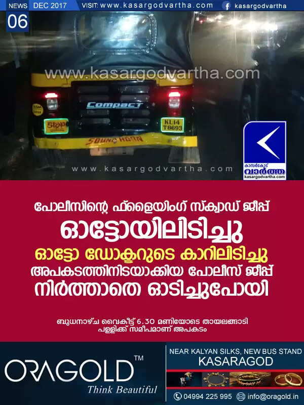 പോലീസിന്റെ ഫ്ളൈയിംഗ് സ്ക്വാഡ് ജീപ്പ് ഓട്ടോയിലിടിച്ചു, ഓട്ടോ ഡോക്ടറുടെ കാറിലിടിച്ചു; അപകടത്തിനിടയാക്കിയ പോലീസ് ജീപ്പ് നിര്ത്താതെ ഓടിച്ചുപോയി