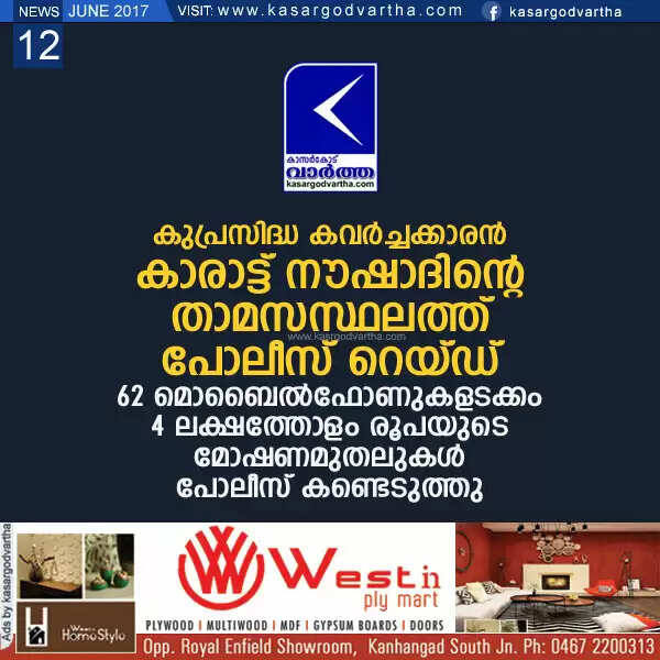 കുപ്രസിദ്ധ കവര്ച്ചക്കാരന് കാരാട്ട് നൗഷാദിന്റെ താമസസ്ഥലത്ത് പോലീസ് റെയ്ഡ്; 62 മൊബൈല്ഫോണുകളടക്കം 4 ലക്ഷത്തോളം രൂപയുടെ മോഷണമുതലുകള് കണ്ടെടുത്തു