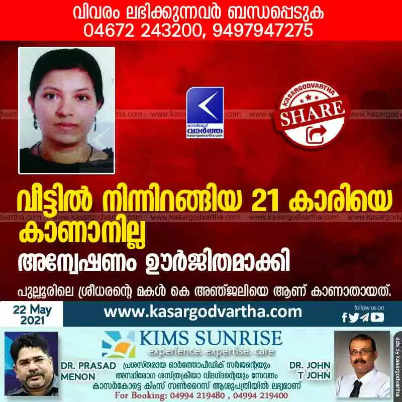 keywords: Kerala, News, Kasaragod, Pullur, Missing, Police, Investigation, complaint, Women, Top-Headlines, Phone-call, Ambalathara, Police seek missing 21 year old woman.