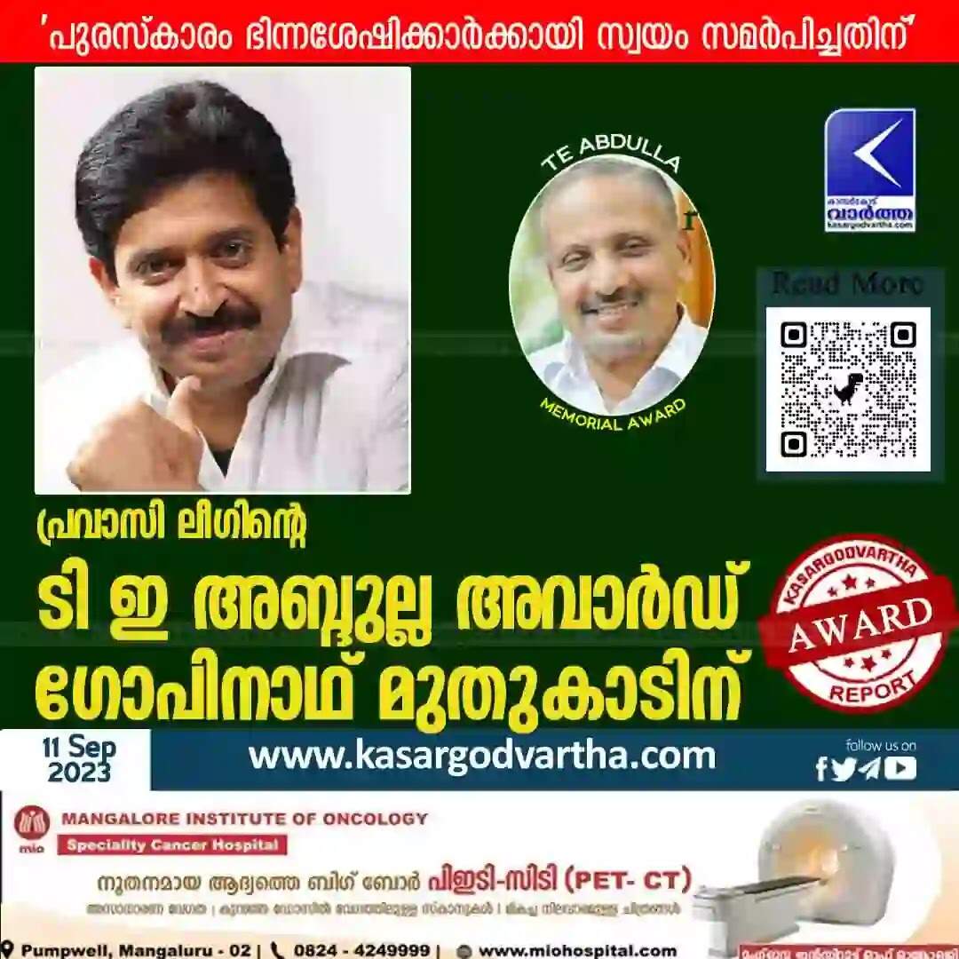 Keywords: News, Kasargod, Kerala, Pravasi League, TE Abdulla, Award, Gopinath Muthukad, Pravasi League's TE Abdullah Award to Gopinath Muthukad.