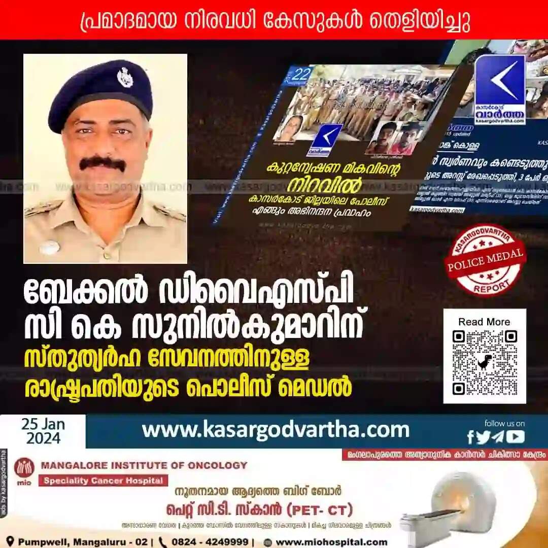 Keywords: News, Malayalam News, Kerala, Kasaragod, Police Medal, C.K Sunikumar, Nileshwaram, President's Police Medal for DYSP Bekal CK Sunilkumar