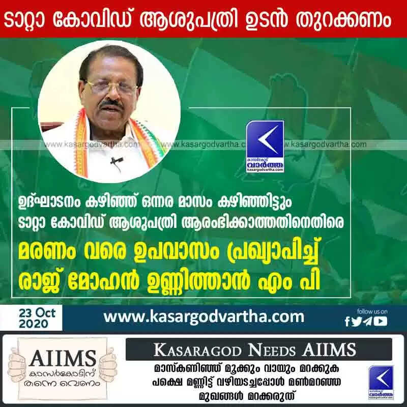 ഉദ്ഘാടനം കഴിഞ്ഞ് ഒന്നര മാസം കഴിഞ്ഞിട്ടും ടാറ്റാ കോവിഡ് ആശുപത്രി ആരംഭിക്കാത്തതിനെതിരെ മരണം വരെ ഉപവാസം പ്രഖ്യാപിച്ച് രാജ് മോഹൻ ഉണ്ണിത്താൻ എം പി