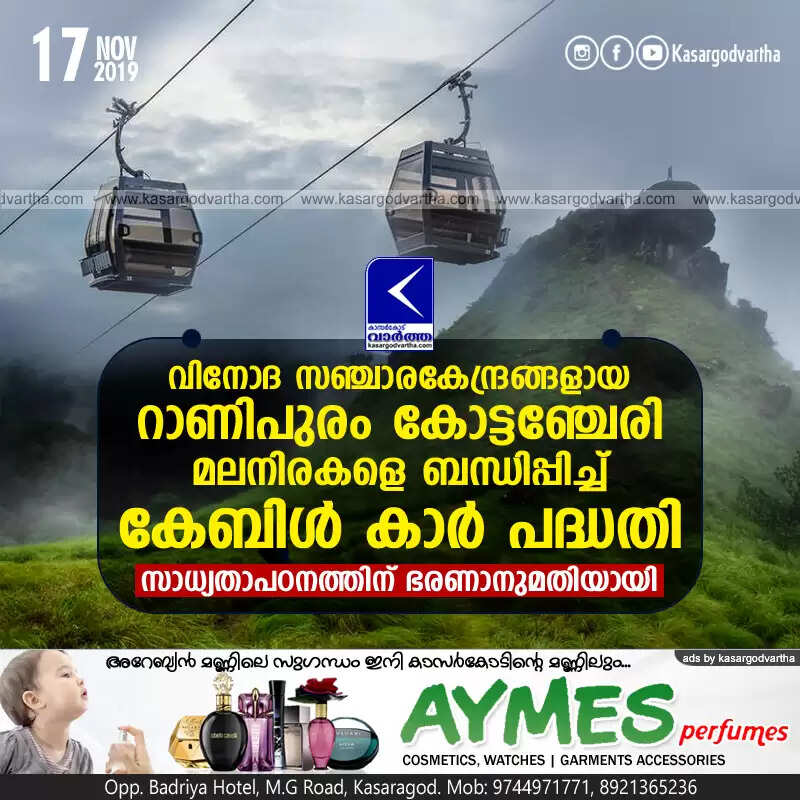 കാസര്‍കോട്: (www.kasargodvartha.com 17.11.2019) കേരളത്തിലെ തന്നെ പ്രധാന വിനോദ സഞ്ചാരകേന്ദ്രങ്ങളായ റാണിപുരത്തെയും കോട്ടഞ്ചേരിയെയും ബന്ധിപ്പിച്ച് കേബിള്‍ കാര്‍ പദ്ധതി നടപ്പിലാക്കുന്നതിന്റെ ഭാഗമായി സാധ്യതാപഠനത്തിന് ഭരണാനുമതിയായി. കാസര്‍കോട് വികസന പാക്കേജ് ജില്ലാതല കമ്മിറ്റിയാണ് സാധ്യതാപഠനത്തിനായി 5.78 ലക്ഷം രൂപയുടെ ഭരണാനുമതി നല്‍കിയത്.