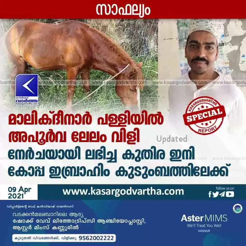 മാലിക്ദീനാർ പള്ളിയിൽ അപൂർവ ലേലം വിളി; സംഭാവനയായി ലഭിച്ച കുതിര ഇനി കോപ്പ ഇബ്രാഹിം കുടുംബത്തിലേക്ക്