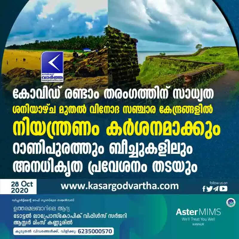 കോവിഡ് രണ്ടാം തരംഗത്തിന് സാധ്യത; ശനിയാഴ്ച മുതല്‍ വിനോദ സഞ്ചാര കേന്ദ്രങ്ങളില്‍ നിയന്ത്രണം കര്‍ശനമാക്കും; റാണിപുരത്തും ബീച്ചുകളിലും അനധികൃത പ്രവേശനം തടയും