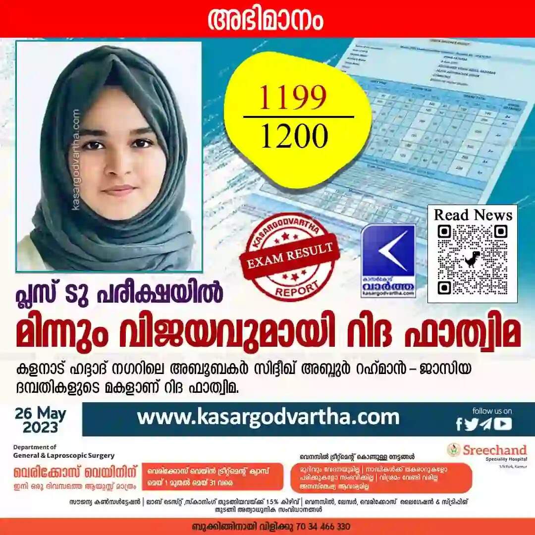 Keywords: News, Kasaragod, Kerala, Exam Result, School, Student, Rida Fatima with brilliant victory in Plus Two exam.