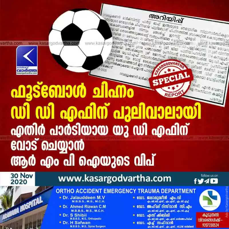 ഫൂട്ബോൾ ചിഹ്നം ഡി ഡി എഫിന് പുലിവാലായി; എതിര് പാര്ടിയായ യു ഡി എഫിന് വോട് ചെയ്യാന് ആര് എം പി ഐയുടെ വിപ്