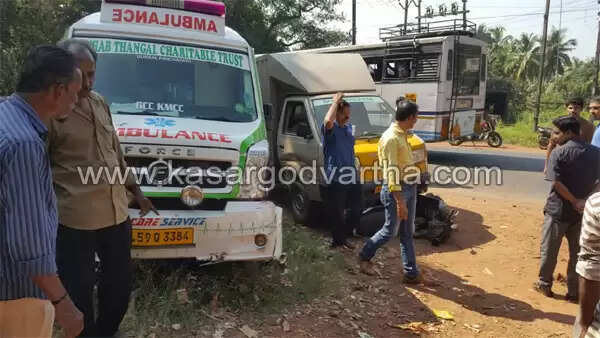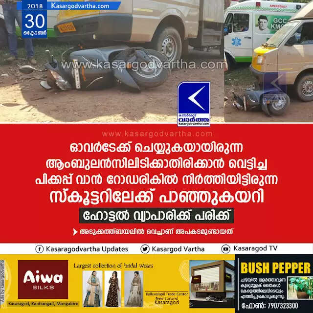 ഓവര്‍ടേക്ക് ചെയ്യുകയായിരുന്ന ആംബുലന്‍സിലിടിക്കാതിരിക്കാന്‍ വെട്ടിച്ച പിക്കപ്പ് വാന്‍ റോഡരികില്‍ നിര്‍ത്തിയിട്ടിരുന്ന സ്‌കൂട്ടറിലേക്ക് പാഞ്ഞുകയറി; ഹോട്ടല്‍ വ്യാപാരിക്ക് പരിക്ക്