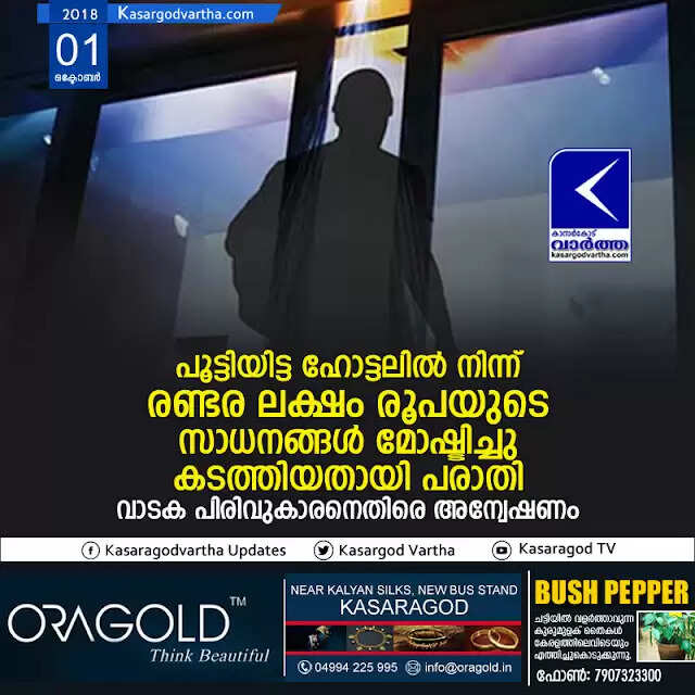 പൂട്ടിയിട്ട ഹോട്ടലില്‍ നിന്ന് രണ്ടര ലക്ഷം രൂപയുടെ സാധനങ്ങള്‍ മോഷ്ടിച്ചു കടത്തിയതായി പരാതി; വാടക പിരിവുകാരനെതിരെ അന്വേഷണം