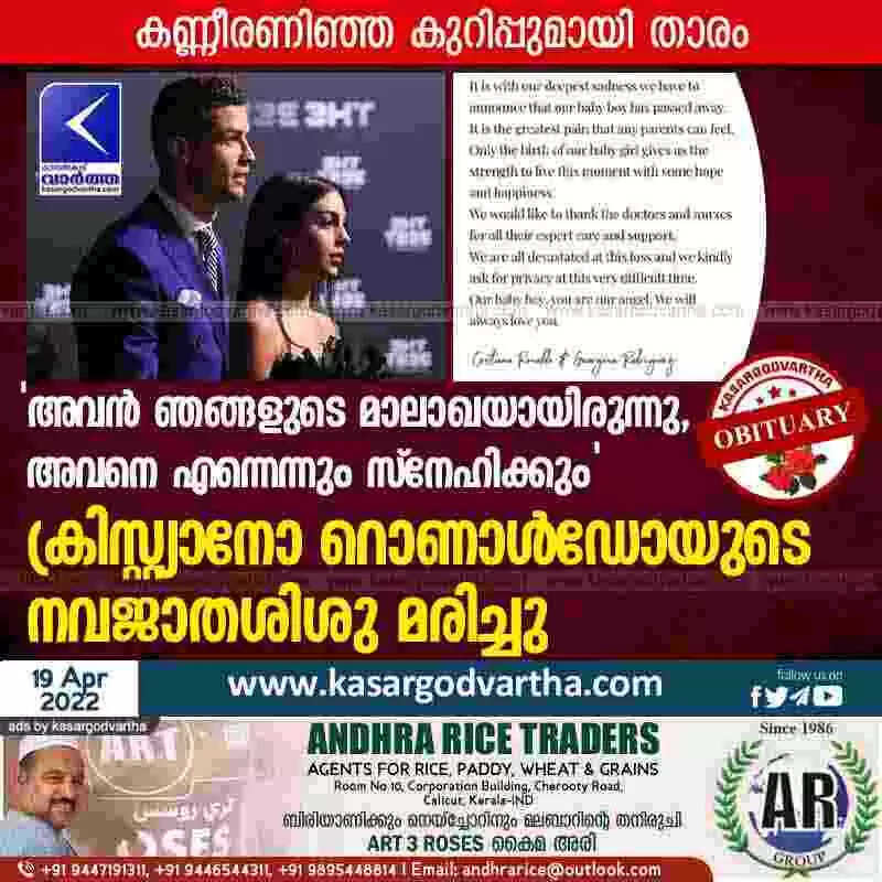 ഈ സംഭവത്തിൽ പൂർണമായും നിരാശരാണെന്നും സ്വകാര്യത ആവശ്യപ്പെടുന്നുവെന്നും റൊണാൾഡോ എഴുതി. 'ഞങ്ങളുടെ മകൻ ഞങ്ങളുടെ മാലാഖയായിരുന്നു, ഞങ്ങൾ അവനെ എപ്പോഴും സ്നേഹിക്കും', താരം പറഞ്ഞു.