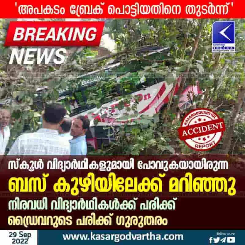 School bus overturned | സ്കൂള് വിദ്യാര്ഥികളുമായി പോവുകയായിരുന്ന ബസ് കുഴിയിലേക്ക് മറിഞ്ഞു; നിരവധി വിദ്യാര്ഥികള്ക്ക് പരിക്ക്; ഡ്രൈവറുടെ നില ഗുരുതരം