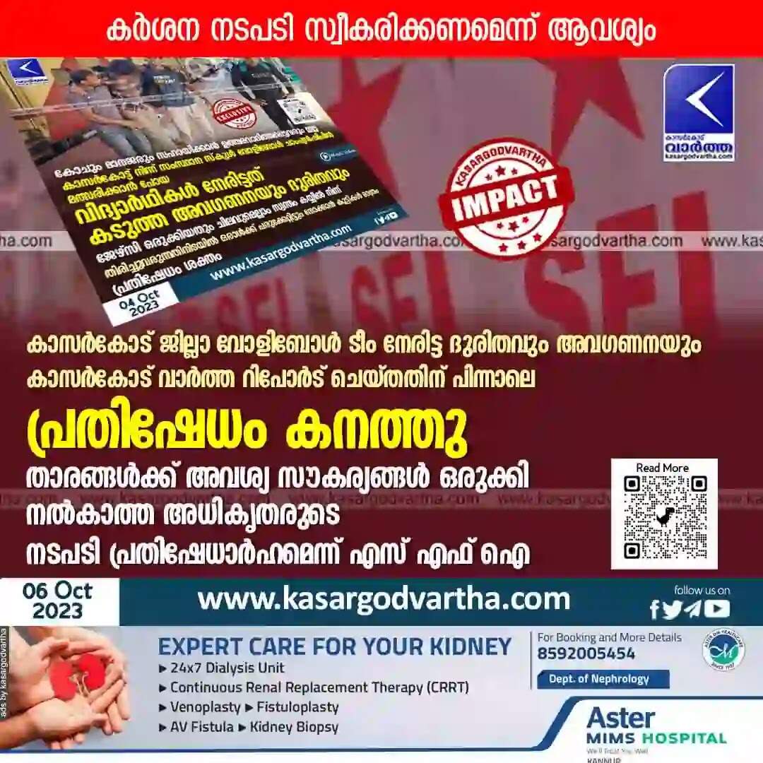 Impact | കാസര്‍കോട് ജില്ലാ വോളിബോള്‍ ടീം നേരിട്ട ദുരിതവും അവഗണനയും കാസര്‍കോട് വാര്‍ത്ത റിപോര്‍ട് ചെയ്തതിന് പിന്നാലെ പ്രതിഷേധം കനത്തു; താരങ്ങള്‍ക്ക് അവശ്യ സൗകര്യങ്ങള്‍ ഒരുക്കി നല്‍കാത്ത അധികൃതരുടെ നടപടി പ്രതിഷേധാര്‍ഹമെന്ന് എസ് എഫ് ഐ