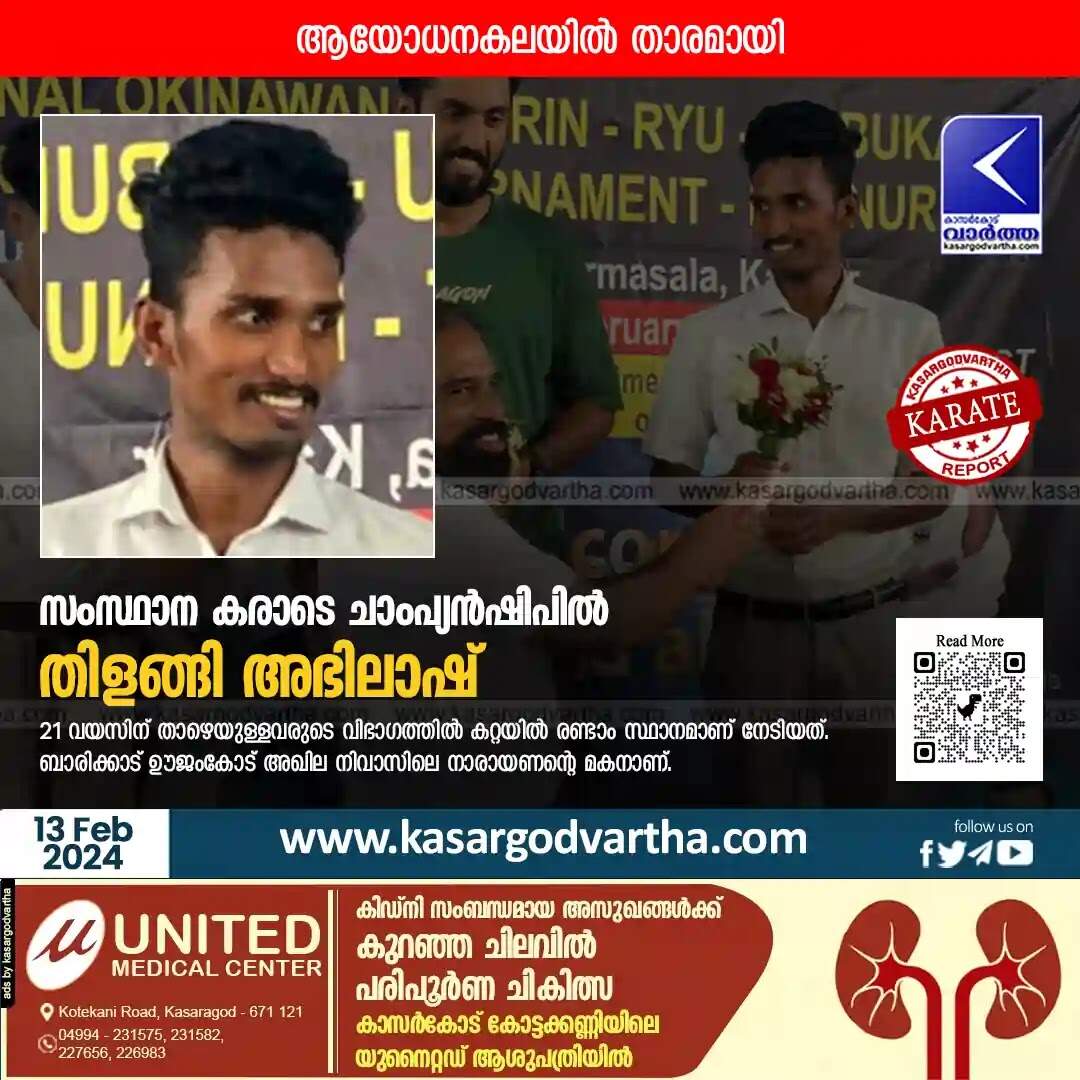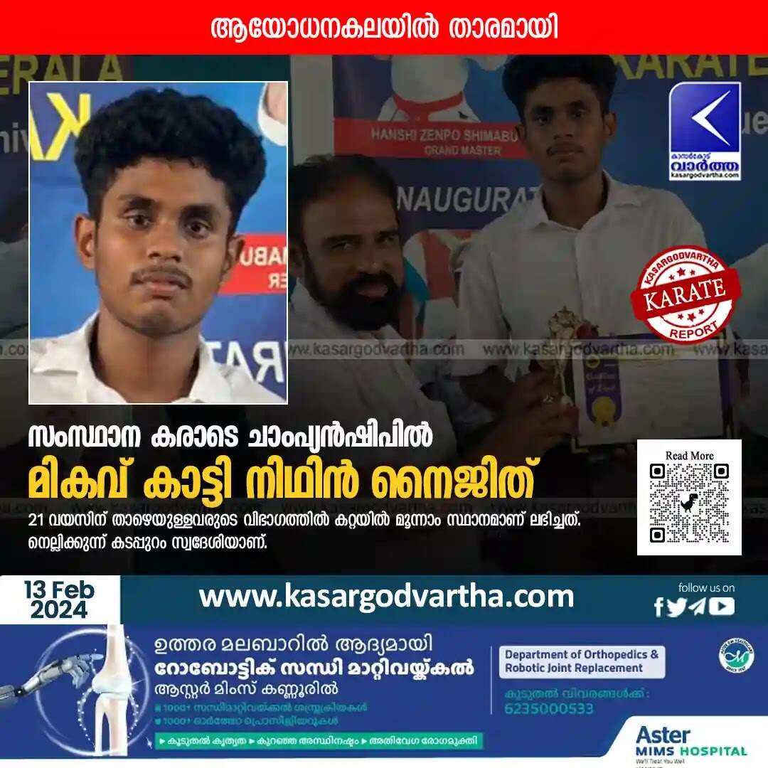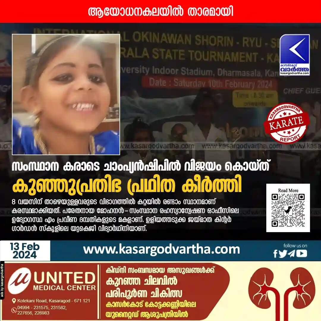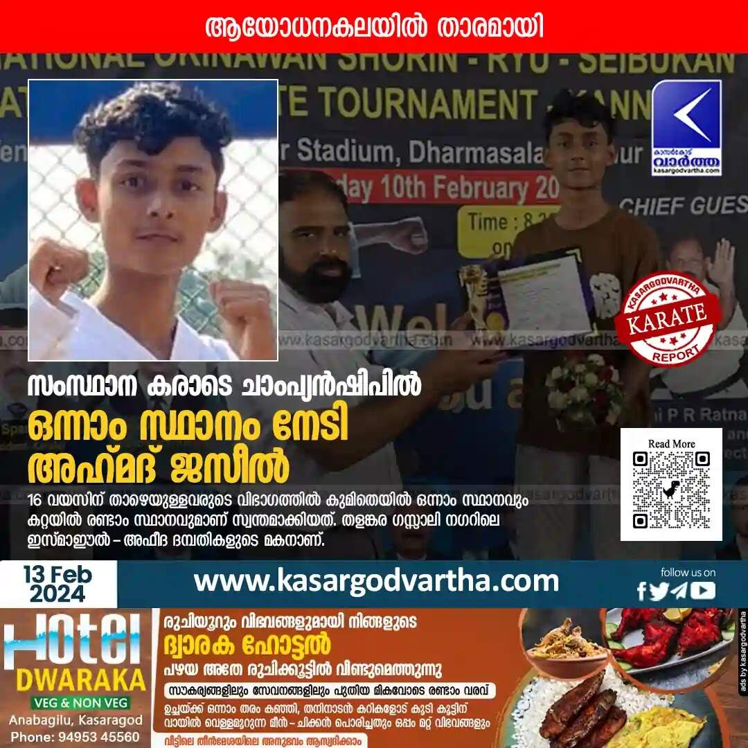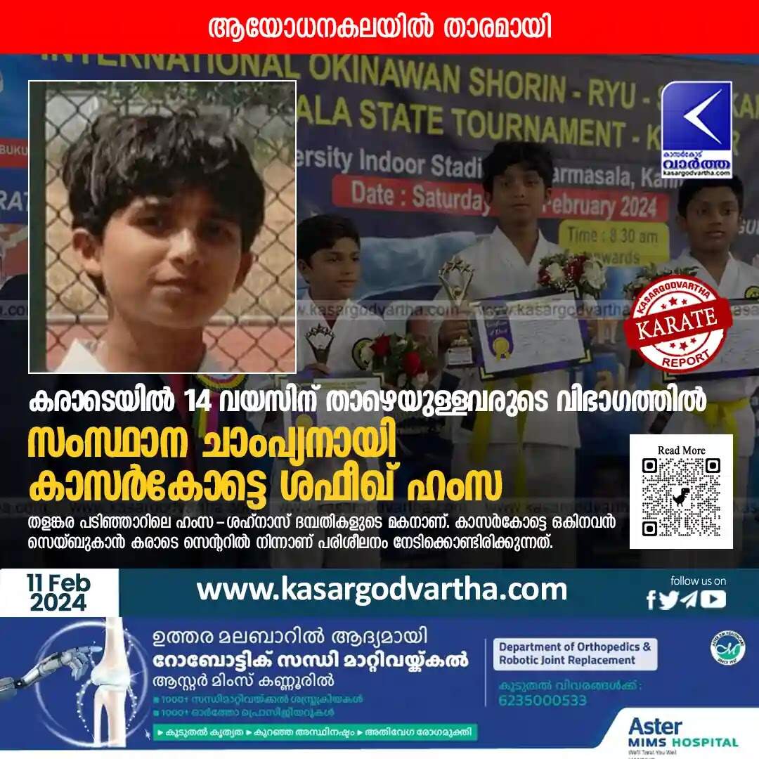 Keywords: Karate, Martial Arts, Kasaragod, Malayalam News, Thalangara, Kannur, Dharmashala, University, Indoor, Stadium, International, Okinawan, Shorin-Ryu, Championship, Fighting, Shafeeq Hamza becomes state champion in karate under 14 category.