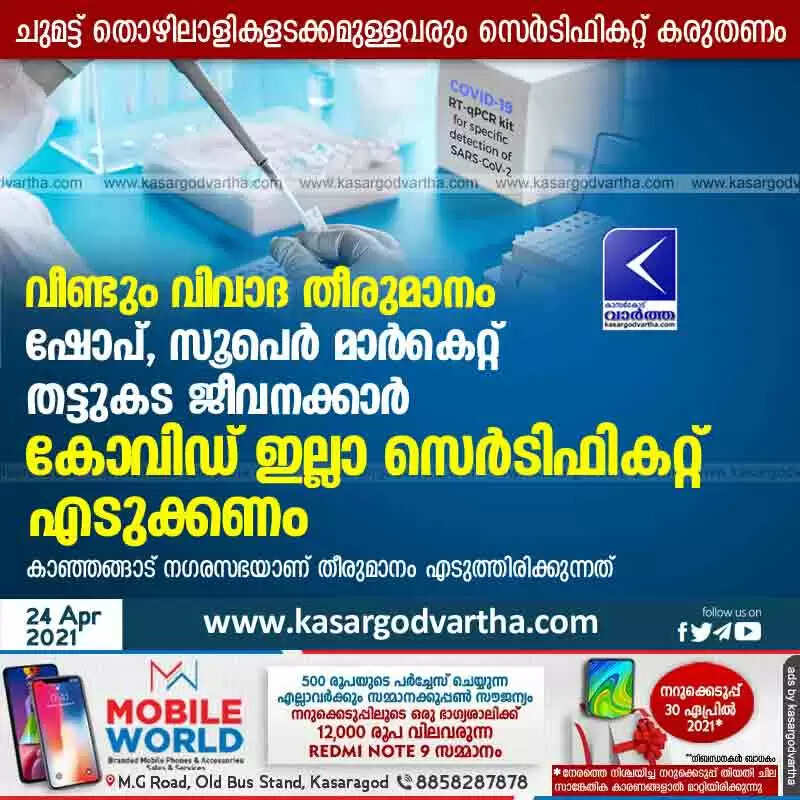 Keywords: Kanhangad, Kasaragod, Kerala, News, Top-Headlines, COVID-19, Certificates, Shop, Employees, Street, Shop, supermarket and street ventor employees must take covid negative certificate.