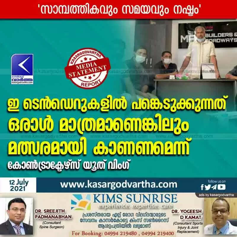 ഇ ടെന്‍ഡെറുകളില്‍ പങ്കെടുക്കുന്നത് ഒരാള്‍ മാത്രമാണെങ്കിലും മത്സരമായി കാണണമെന്ന് കോണ്‍ട്രാക്ടേഴ്‌സ് യൂത് വിംഗ്