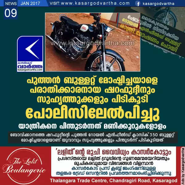പുത്തന്‍ ബുള്ളറ്റ് മോഷ്ടിച്ചയാളെ പരാതിക്കാരനായ ഷറഫുദ്ദീനും സുഹൃത്തുക്കളും പിടികൂടി പോലീസിലേല്‍പിച്ചു; യാത്രികനെ പിന്തുടര്‍ന്നത് മണിക്കൂറുകളോളം