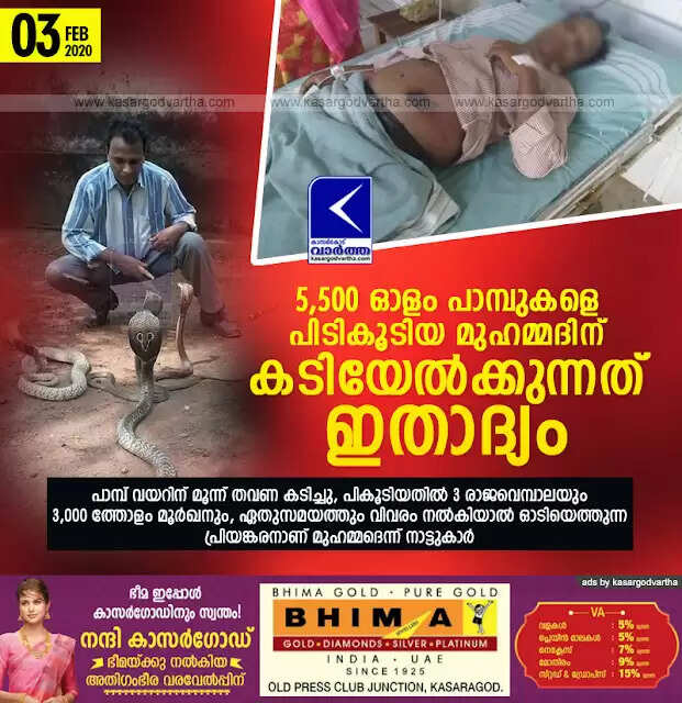 5,500 ഓളം പാമ്പുകളെ പിടികൂടിയ മുഹമ്മദിന് കടിയേല്‍ക്കുന്നത് ഇതാദ്യം; പാമ്പ് വയറിന് മൂന്ന് തവണ കടിച്ചു, പികൂടിയതില്‍ 3 രാജവെമ്പാലയും 3,000 ത്തോളം മൂര്‍ഖനും, ഏതുസമയത്തും വിവരം നല്‍കിയാല്‍ ഓടിയെത്തുന്ന പ്രിയങ്കരനാണ് മുഹമ്മദെന്ന് നാട്ടുകാര്‍