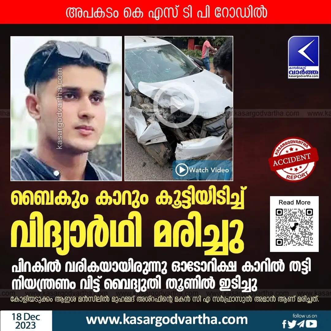Accident | ബൈകും കാറും കൂട്ടിയിടിച്ച് വിദ്യാർഥി മരിച്ചു; പിറകിൽ വരികയായിരുന്നു ഓടോറിക്ഷ കാറിൽ തട്ടി നിയന്ത്രണം വിട്ട് വൈദ്യുതി തൂണിൽ ഇടിച്ചു