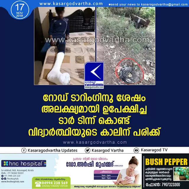 റോഡ് ടാറിംഗിനു ശേഷം അലക്ഷ്യമായി ഉപേക്ഷിച്ച ടാര് ടിന്ന് കൊണ്ട് വിദ്യാര്ത്ഥിയുടെ കാലിന് പരിക്ക്