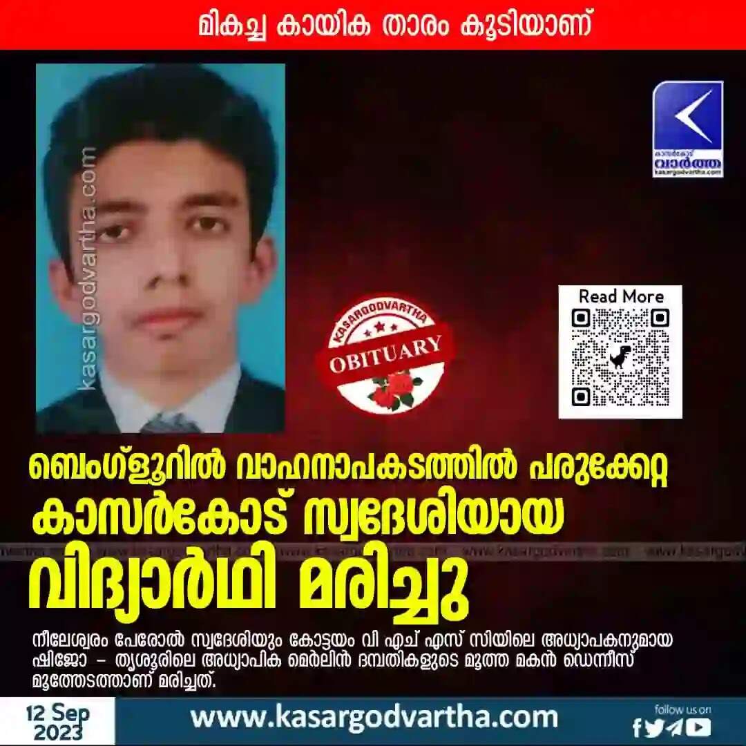 നീലേശ്വരം: (www.kasargodvartha.com) ബെംഗ്ളൂറിൽ വാഹനാപകടത്തിൽ പരുക്കേറ്റ കാസർകോട് സ്വദേശിയായ ബിരുദ വിദ്യാർഥി മരിച്ചു. നീലേശ്വരം പേരോൽ സ്വദേശിയും കോട്ടയം വി എച് എസ് സിയിലെ അധ്യാപകനുമായ ഷിജോ - തൃശൂരിലെ അധ്യാപിക മെർലിൻ ദമ്പതികളുടെ മൂത്ത മകൻ ഡെന്നീസ് മൂത്തേടത്ത് (19) ആണ് മരിച്ചത്.