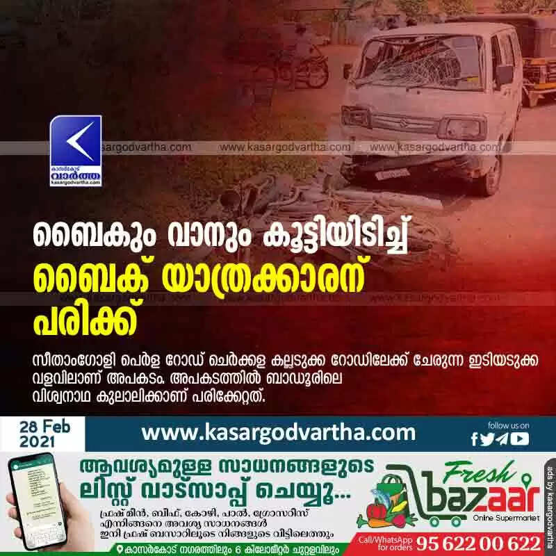 Keywords: Kerala, News, Perla, Kasaragod, Accident, Omni Van, Bike, Top-Headlines, Injured, Hospital, Road, The bike passenger was injured after bike - van collision.
