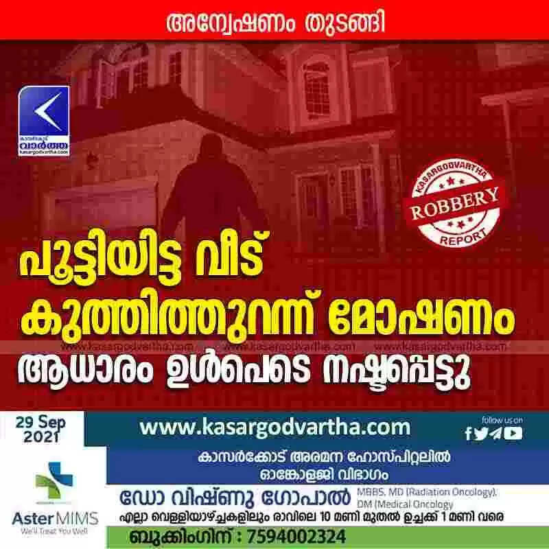 Keywords: Kasaragod, News, Top-Headlines, House, Case, Police, Robbery, Theft in locked house.