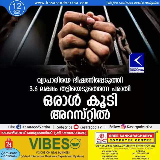 വിദ്യാനഗര്‍: (www.kasargodvartha.com 12.06.2019) വ്യാപാരിയെ ഭീഷണിപ്പെടുത്തി 3.6 ലക്ഷം തട്ടിയെടുത്തെന്ന പരാതിയില്‍ കേസെടുത്ത പോലീസ് ഒരാളെ കൂടി അറസ്റ്റു ചെയ്തു. ആലംപാടി മിനി ഇന്‍ഡസ്ട്രിയല്‍ എസ്റ്റേറ്റിനു സമീപത്തെ ബി എം അബ്ദുല്‍ ഖാദറിനെ (19) യാണ് വിദ്യാനഗര്‍ പോലീസ് അറസ്റ്റു ചെയ്തത്.  ചെങ്കള ബംബ്രാണി നഗര്‍ സ്വദേശിയും വ്യാപാരിയുമായ സി എ മുനീര്‍ (24) ആണ് കേസില്‍പ്പെടുത്തുമെന്ന് ഭീഷണിപ്പെടുത്തി പണം തട്ടിയെടുത്തുവെന്ന പരാതിയുമായി പോലീസിലെത്തിയത്.