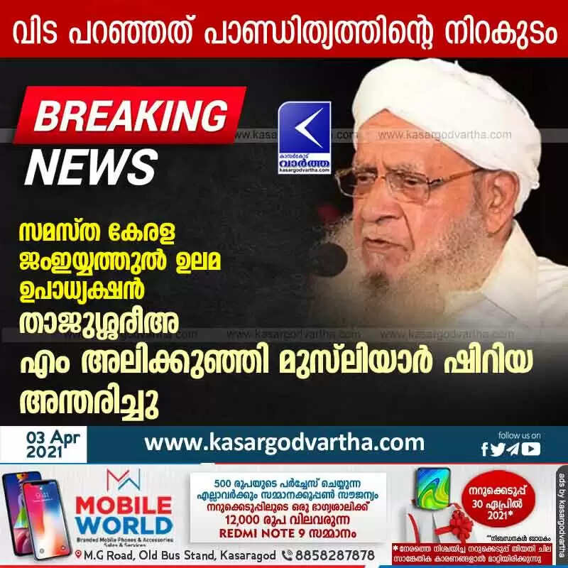 കുമ്പള: (www.kasargodvartha.com 03.04.2021) സമസ്ത കേരള ജംഇയ്യത്തുൽ ഉലമയുടെ ഉപാധ്യക്ഷനും പ്രമുഖ പണ്ഡിതനുമായ താജുശ്ശരീഅ എം അലിക്കുഞ്ഞി മുസ്‌ലിയാർ ഷിറിയ (86) അന്തരിച്ചു. ഖബറടക്കം വൈകുന്നേരം അഞ്ച് മണിക്ക്  ഷിറിയ ലത്വീഫിയ്യ അങ്കണത്തിൽ നടക്കും.
