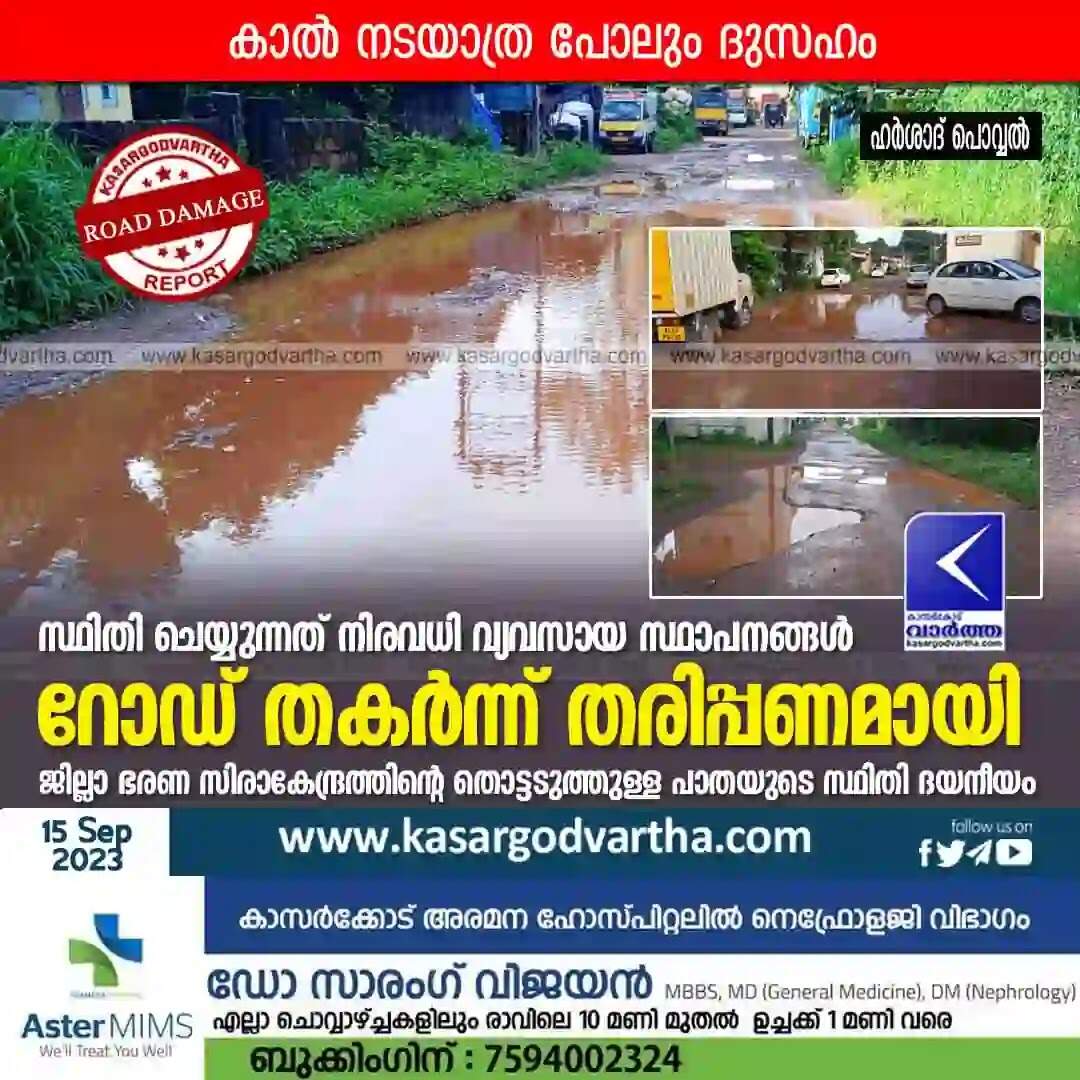 Road | സ്ഥിതി ചെയ്യുന്നത് നിരവധി വ്യവസായ സ്ഥാപനങ്ങള്; റോഡ് തകര്ന്ന് തരിപ്പണമായി; ജില്ലാ ഭരണ സിരാകേന്ദ്രത്തിന്റെ തൊട്ടടുത്തുള്ള പാതയുടെ സ്ഥിതി ദയനീയം