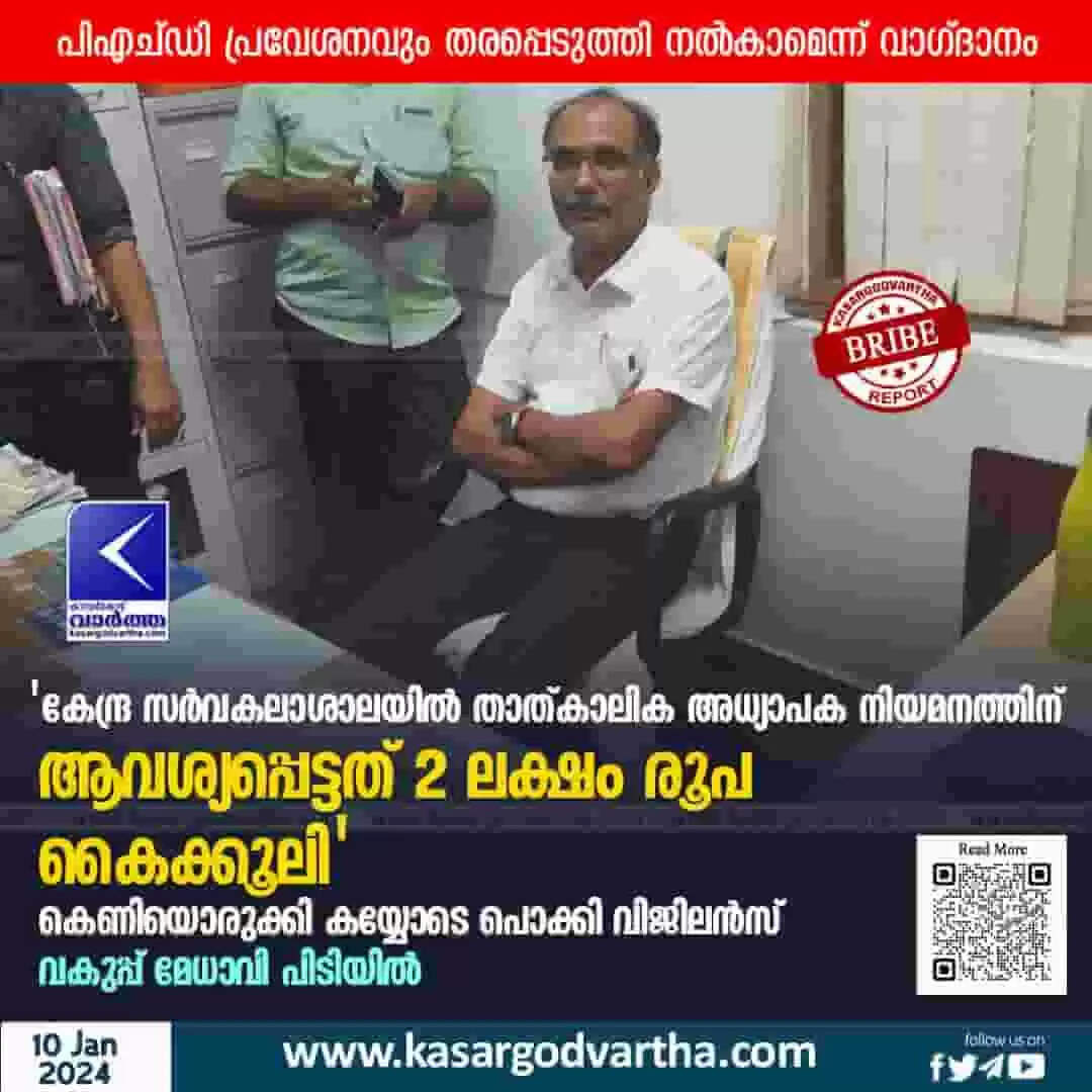 HOD Arrested | 'കേന്ദ്ര സർവകലാശാലയിൽ താത്കാലിക അധ്യാപക നിയമനത്തിന് ആവശ്യപ്പെട്ടത് 2 ലക്ഷം രൂപ കൈക്കൂലി'; കെണിയൊരുക്കി കയ്യോടെ പൊക്കി വിജിലൻസ്; വകുപ്പ് മേധാവി പിടിയിൽ