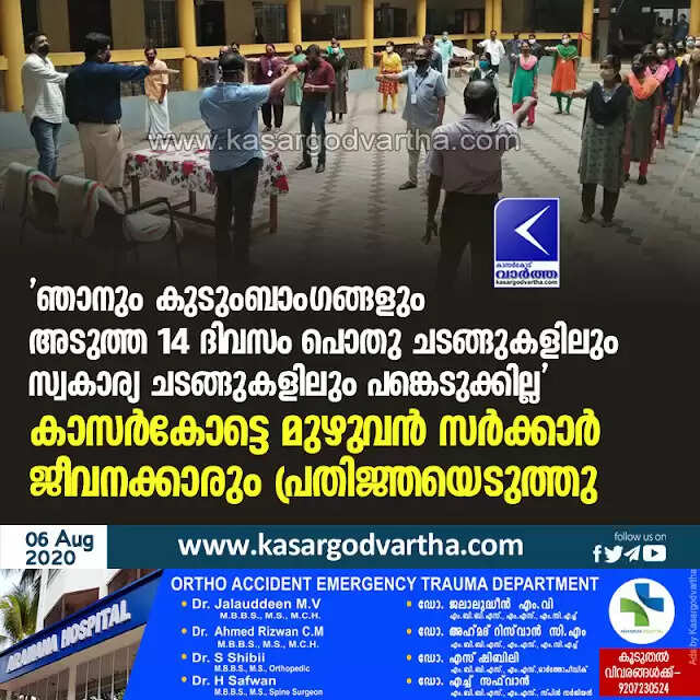 'ഞാനും കുടുംബാംഗങ്ങളും അടുത്ത 14 ദിവസം പൊതു ചടങ്ങുകളിലും സ്വകാര്യ ചടങ്ങുകളിലും പങ്കെടുക്കില്ല'; കാസര്കോട്ടെ മുഴുവന് സര്ക്കാര് ജീവനക്കാരും പ്രതിജ്ഞയെടുത്തു