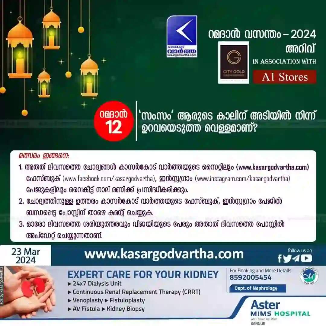 (KasargodVartha) അറിവ് 12 (23.03.2024): 'സംസം' ആരുടെ കാലിന് അടിയിൽ നിന്ന് ഉറവയെടുത്ത വെള്ളമാണ്?