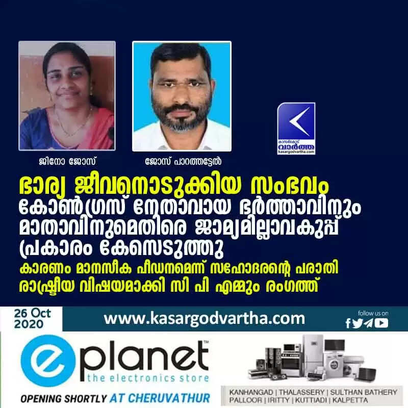 കോൺഗ്രസ് കുറ്റിക്കോൽ മണ്ഡലം പ്രസിഡണ്ടും കുറ്റിക്കോൽ ഗ്രാമ പഞ്ചായത്ത് കരിവേടം വാർഡ് മെമ്പറുമായ ജോസ് പാറത്തട്ടേലിന്റെ ഭാര്യ ജിനോ ജോസ് ( 35) ആണ് വിഷം കഴിച്ച് മരിച്ചത്. ജോസിനും മാതാവ് മേരിക്കുമെതിരെയാണ് പോലീസ് കേസെടുത്തത്.