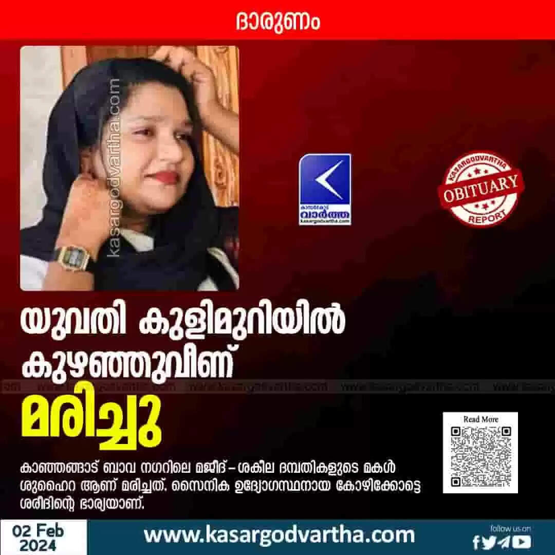 വെള്ളിയാഴ്ച വൈകീട്ട് അഞ്ച് മണിയോടെയാണ് സംഭവം. കുളിമുറിയിൽ കുഴഞ്ഞുവീണ യുവതിയെ ഉടൻ ആശുപത്രിയിലെത്തിച്ചെങ്കിലും ജീവൻ രക്ഷിക്കാനായില്ല. ഹൃദയാഘാതമാണ് മരണകാരണമെന്ന് സംശയിക്കുന്നു. സഹോദരങ്ങൾ: ഫവാസ്, സഫീദ.