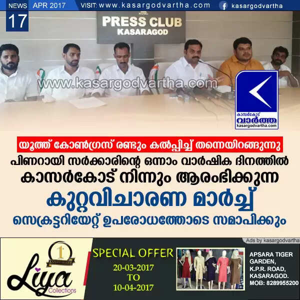 യൂത്ത് കോണ്ഗ്രസ് രണ്ടും കല്പ്പിച്ച് തന്നെയിറങ്ങുന്നു; പിണറായി സര്ക്കാരിന്റെ ഒന്നാം വാര്ഷിക ദിനത്തില് കാസര്കോട് നിന്നും ആരംഭിക്കുന്ന കുറ്റവിചാരണ മാര്ച്ച് സെക്രട്ടറിയേറ്റ് ഉപരോധത്തോടെ സമാപിക്കും