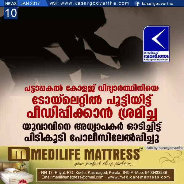 പട്ടാപ്പകല് കോളജ് വിദ്യാര്ത്ഥിനിയെ ടോയ്ലെറ്റില് പൂട്ടിയിട്ട് പീഡിപ്പിക്കാന് ശ്രമിച്ച യുവാവിനെ അധ്യാപകര് ഓടിച്ചിട്ട് പിടികൂടി പോലീസിലേല്പ്പിച്ചു