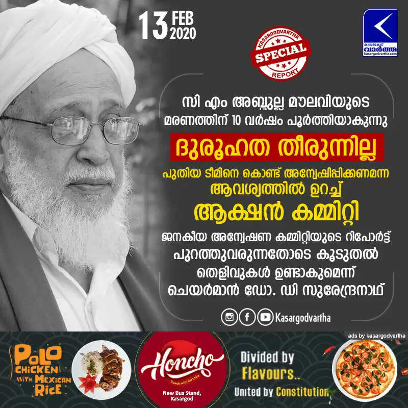 ഖാസി സി എം അബ്ദുല്ല മൗലവിയുടെ മരണത്തിന് 10 വര്ഷം പൂര്ത്തിയാകുന്നു; ദുരൂഹത തീരുന്നില്ല; പുതിയ ടീമിനെ കൊണ്ട് അന്വേഷിപ്പിക്കണമന്ന ആവശ്യത്തില് ഉറച്ച് ആക്ഷന് കമ്മിറ്റി, ജനകീയ അന്വേഷണ കമ്മിറ്റിയുടെ റിപോര്ട്ട് പുറത്തുവരുന്നതോടെ കൂടുതല് തെളിവുകള് ഉണ്ടാകുമെന്ന് ചെയര്മാന് ഡോ. ഡി സുരേന്ദ്രനാഥ്