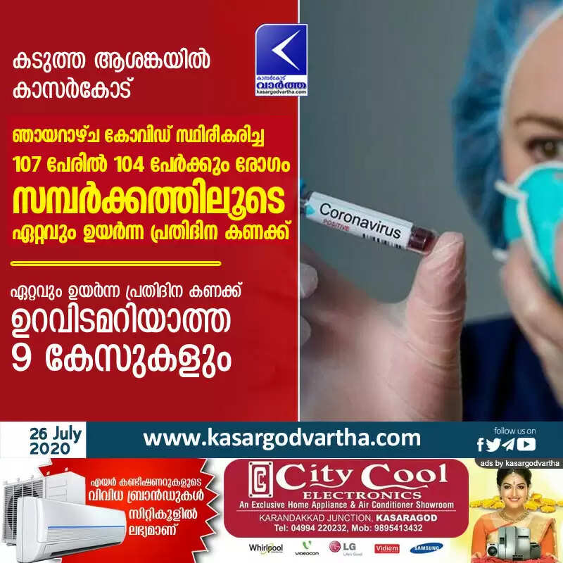 കടുത്ത ആശങ്കയില്‍ കാസര്‍കോട്; ഞായറാഴ്ച കോവിഡ് സ്ഥിരീകരിച്ച 107 പേരില്‍ 104 പേര്‍ക്കും രോഗം സമ്പര്‍ക്കത്തിലൂടെ, ഏറ്റവും ഉയര്‍ന്ന പ്രതിദിന കണക്ക്, ഉറവിടമറിയാത്ത 9 കേസുകളും