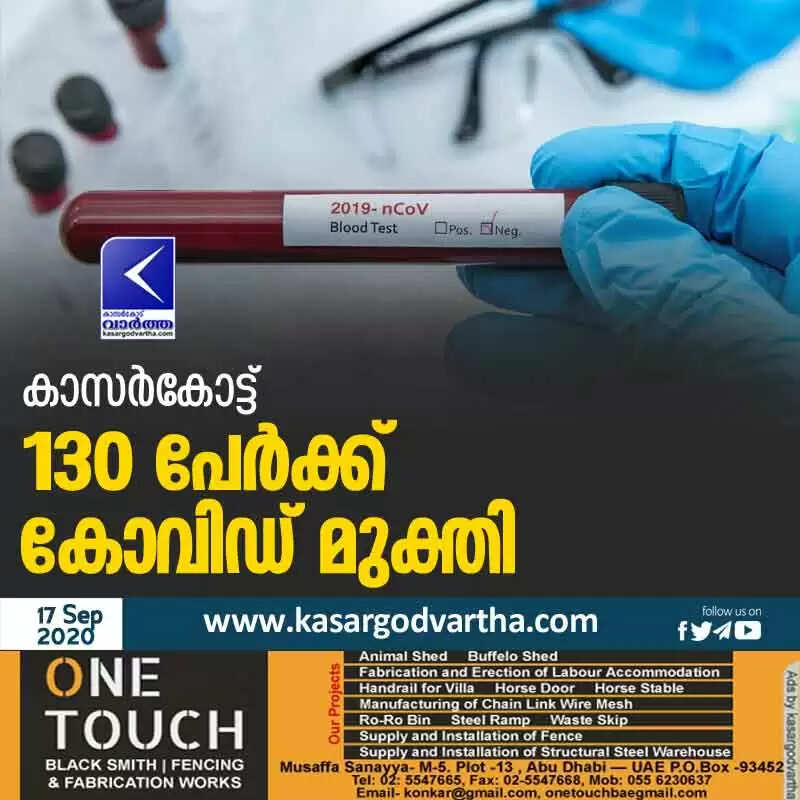 കാസർകോട്ട് 130 പേര്ക്ക് കോവിഡ് മുക്തി